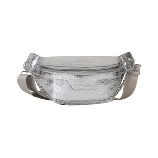 Sac banane à bandoulière en cuir argenté avec une chaîne