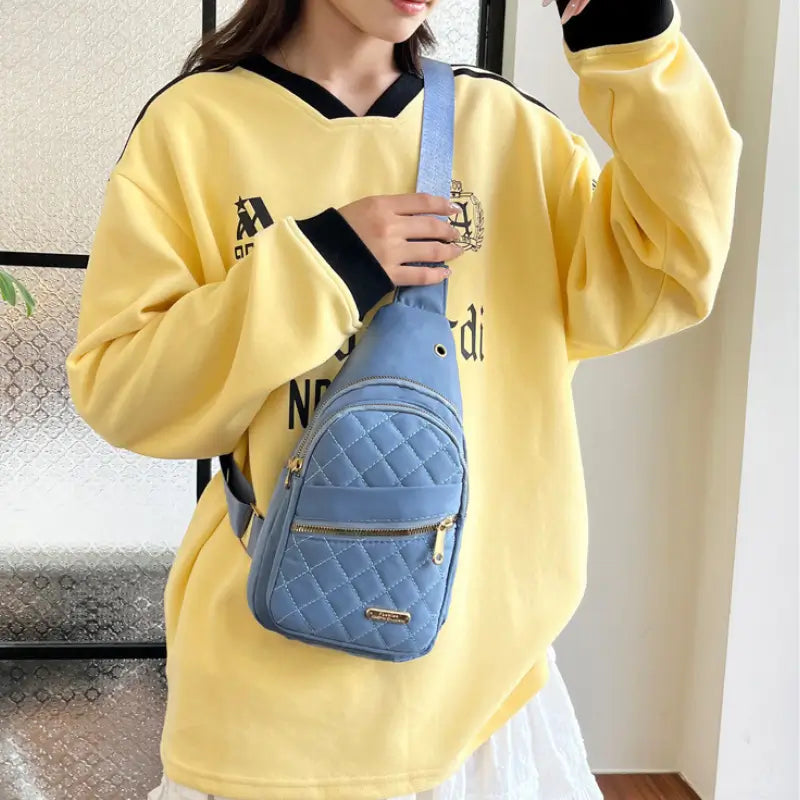 La Sacoche poitrine bleue à bandoulière pour femme est conçue pour être portée pendant de longues périodes sans causer de gêne. La bandoulière est réglable et rembourrée pour un confort optimal. Imaginez-vous faire du shopping toute la journée sans ressentir de douleur à l'épaule. Avec cette sacoche, vous pouvez profiter de vos journées sans vous fatiguer.