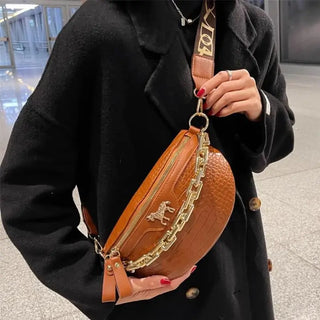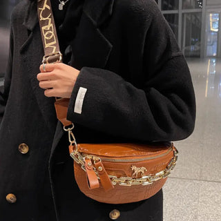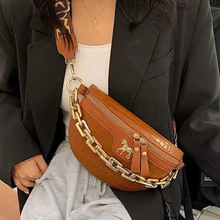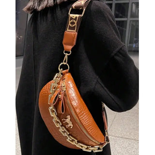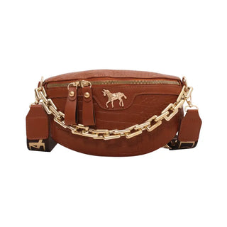 Un sac banane camel à bandoulière conçu en faux cuir de crocodile pour avoir un style luxueux et éco-responsable