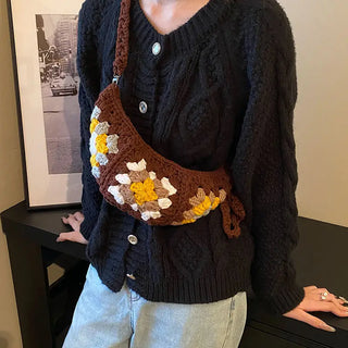 Un sac banane bandoulière au crochet marron de style bohème et ethnique
