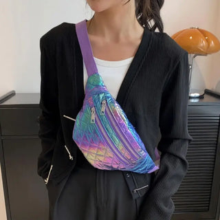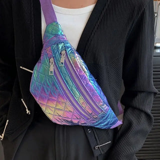 Un sac banane multicolore matelassé à effet holographique ou confort et praticité sont au rendez-vous