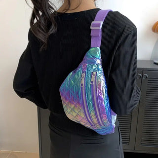 Qui a dit que la mode doit être ennuyeuse ? Avec notre sac banane multicolore matelassé et holographique, vous ajouterez une touche de fantaisie et de jovialité à votre style. Ses couleurs vives et son effet holographique vous feront sortir du lot. Imaginez-vous à un festival, dansant sous les étoiles, avec votre sac banane holographique qui capte chaque reflet de lumière, vous transformant en véritable attraction.